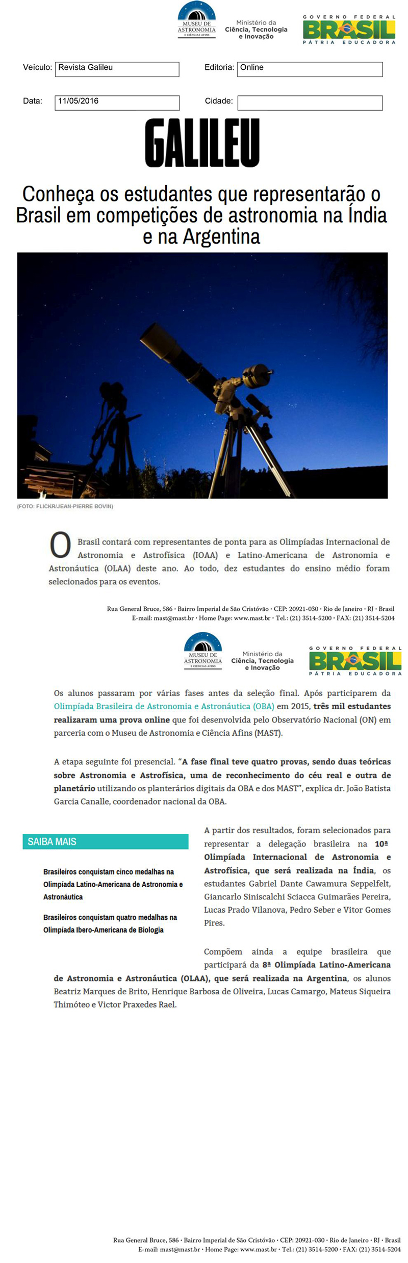 Revista Galileu | Conheça os estudantes que representarão o Brasil em competições de astronomia na Índia e na Argentina