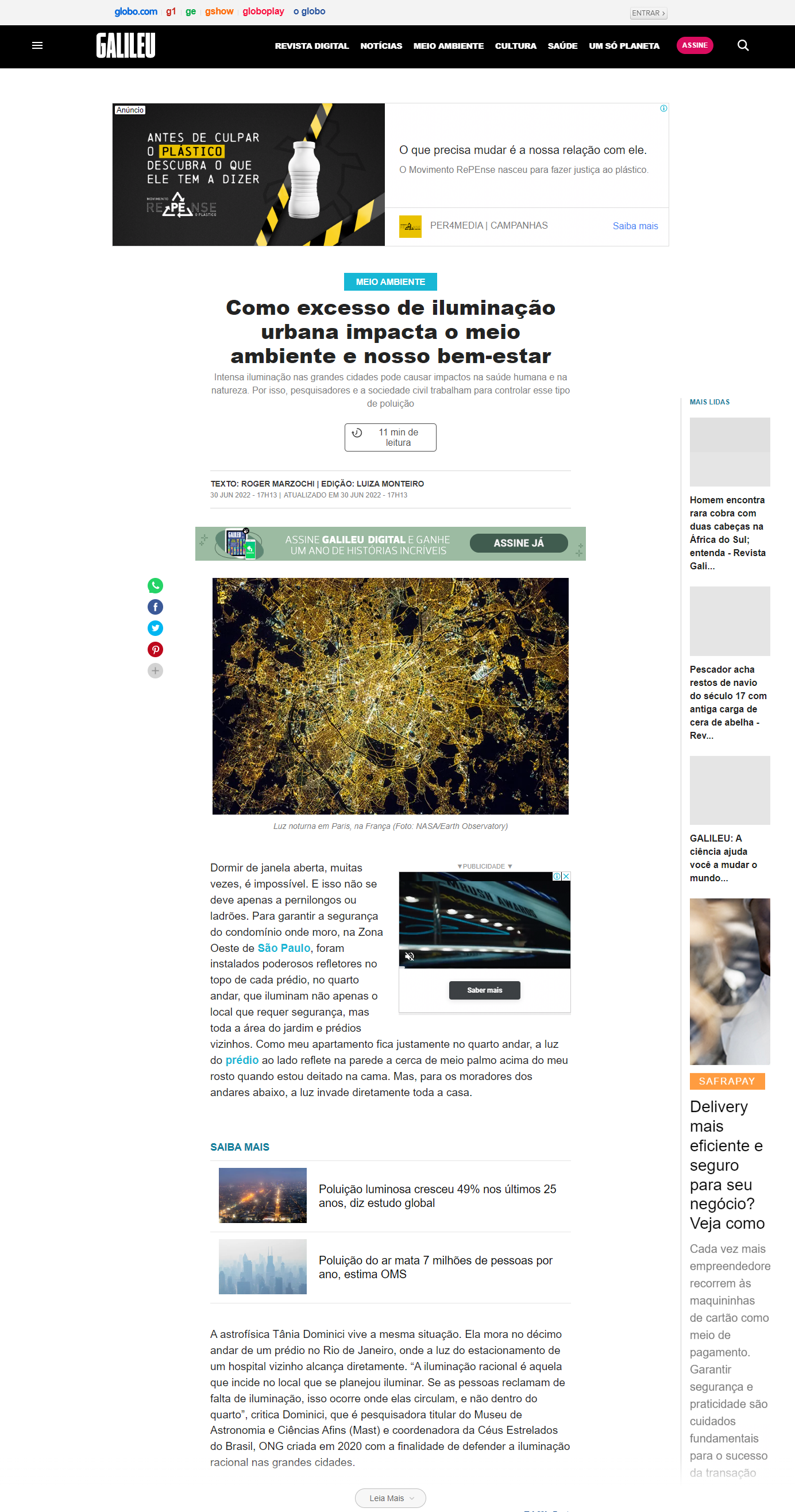 Revista Galileu - MAST na reportagem "Como excesso de iluminação urbana impacta o meio ambiente e nosso bem-estar"