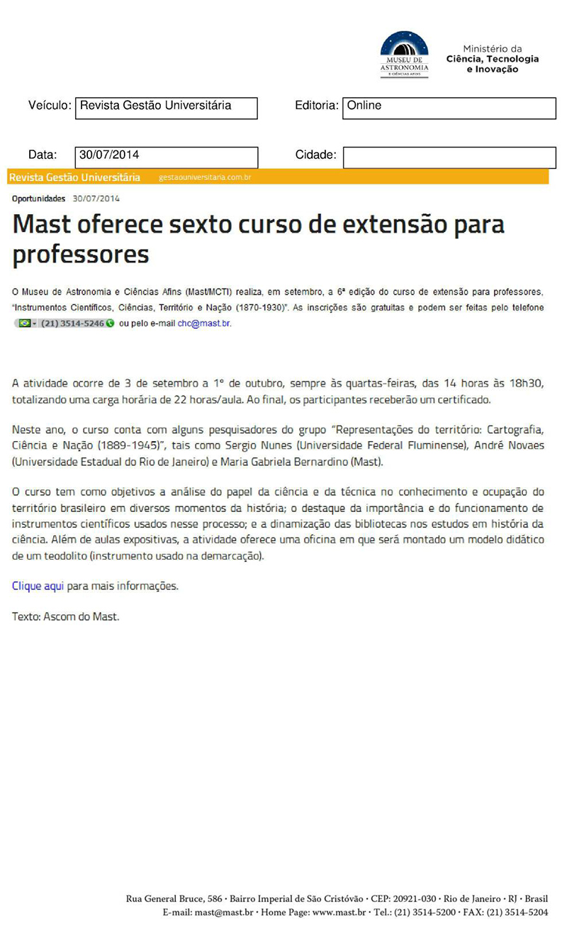 Revista Gestão Universitária | MAST oferece sexto curso de extensão para professores