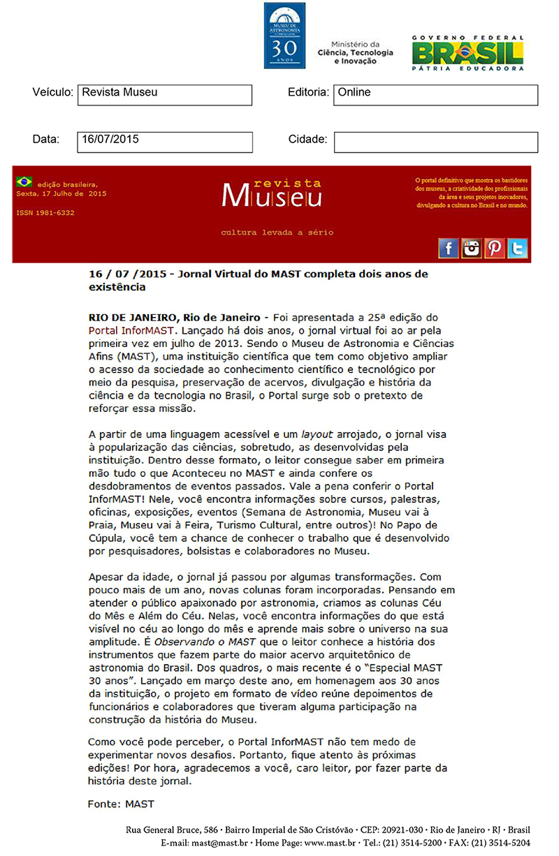 Revista Museu | Jornal Virtual do MAST completa dois anos de existência