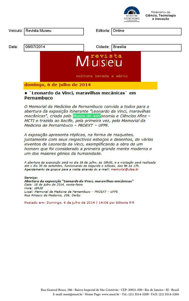 Revista Museu | "Leonardo da Vinci, Maravilhas Mecânicas" em Pernambuco