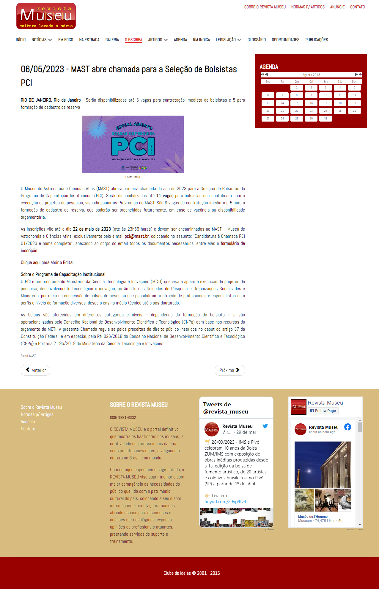 Revista Museu - MAST abre chamada para a Seleção de Bolsistas PCI