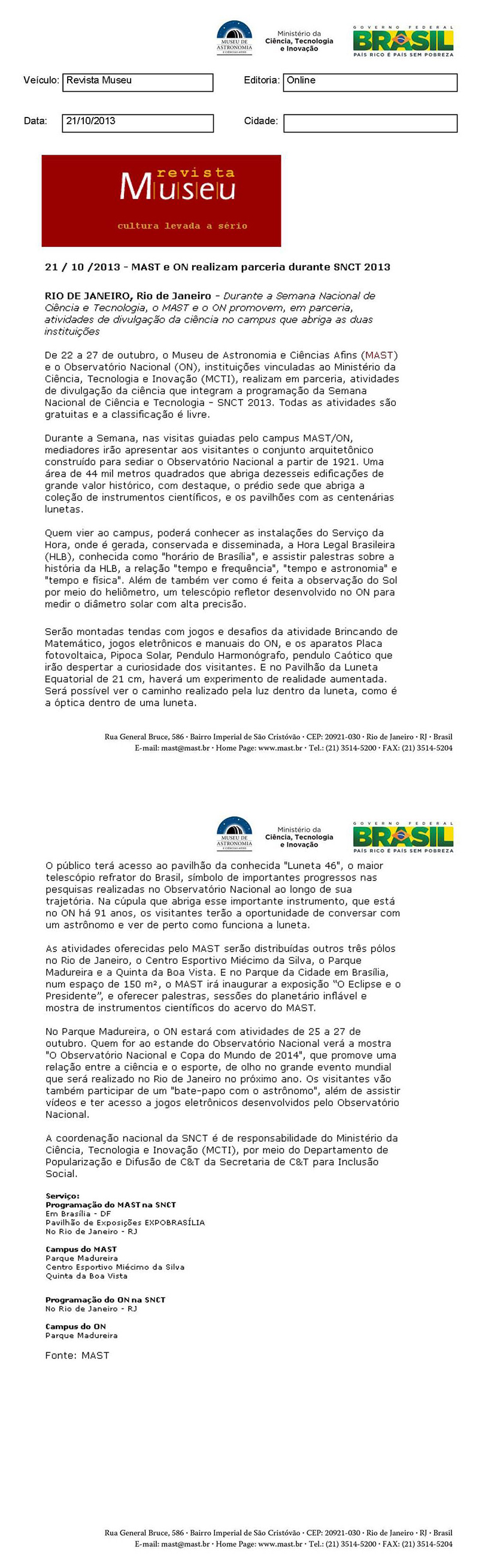 Revista Museu | MAST e ON realizam parceria durante SNCT 2013