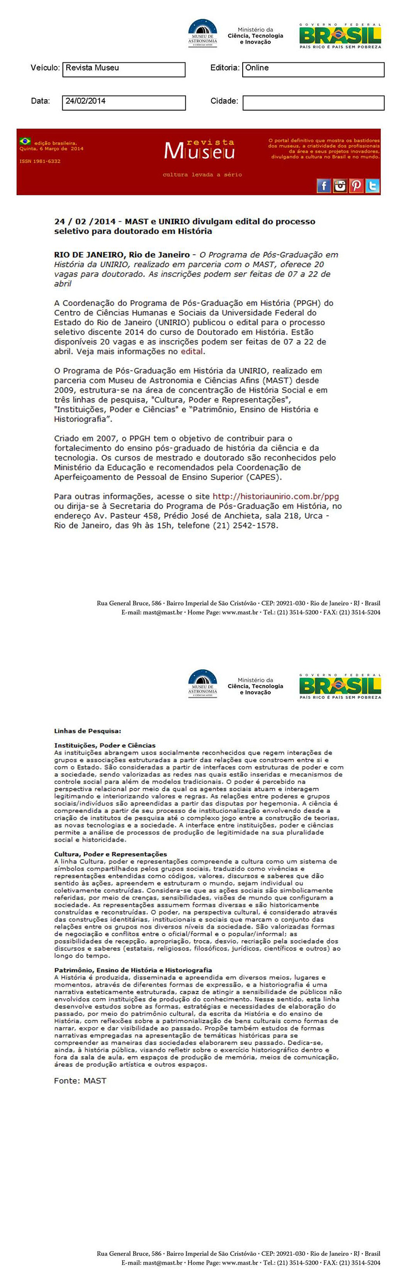 Revista Museu | MAST e UNIRIO divulgam edital do processo seletivo para doutorado em História