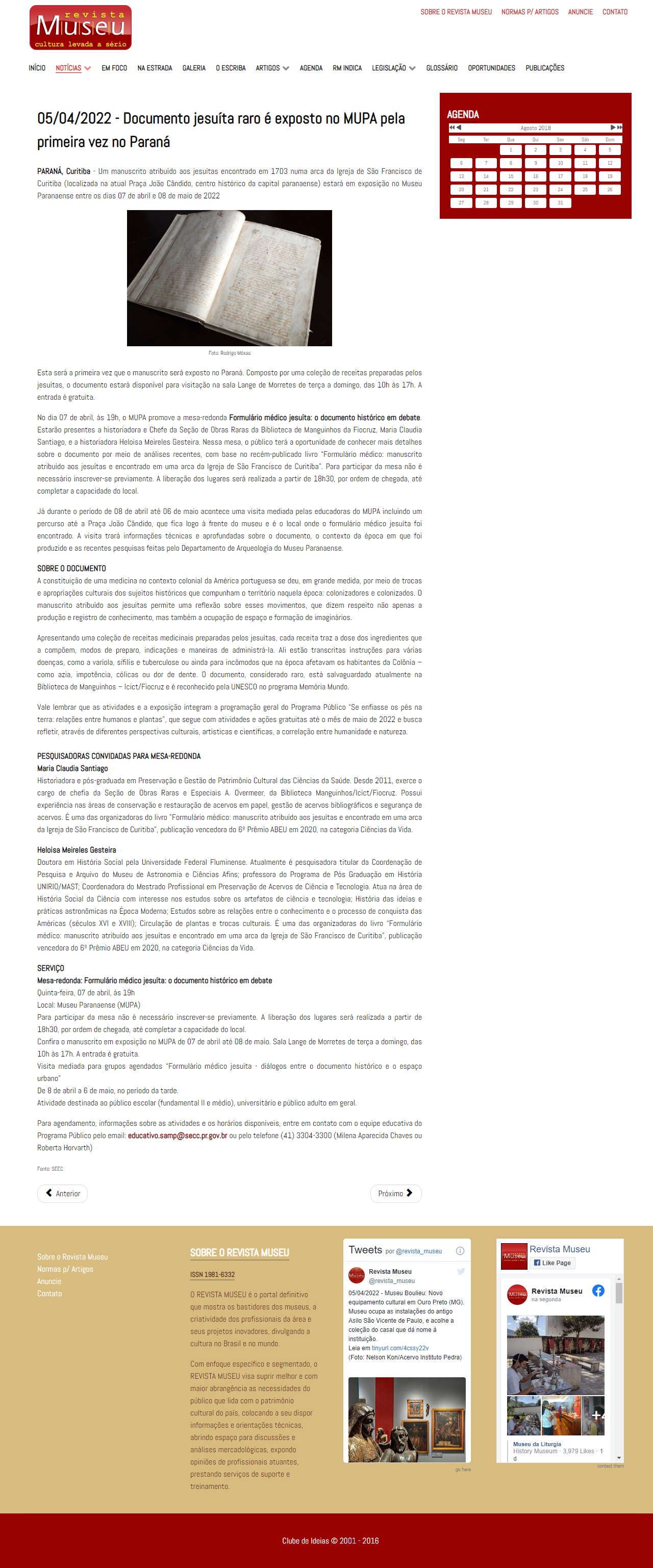 Revista Museu - MAST na reportagem 'Documento jesuíta raro é exposto no MUPA pela primeira vez no Paraná'