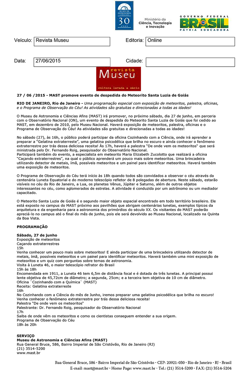 Revista Museu | MAST promove evento de despedida do Meteorito Santa Luzia de Goiás
