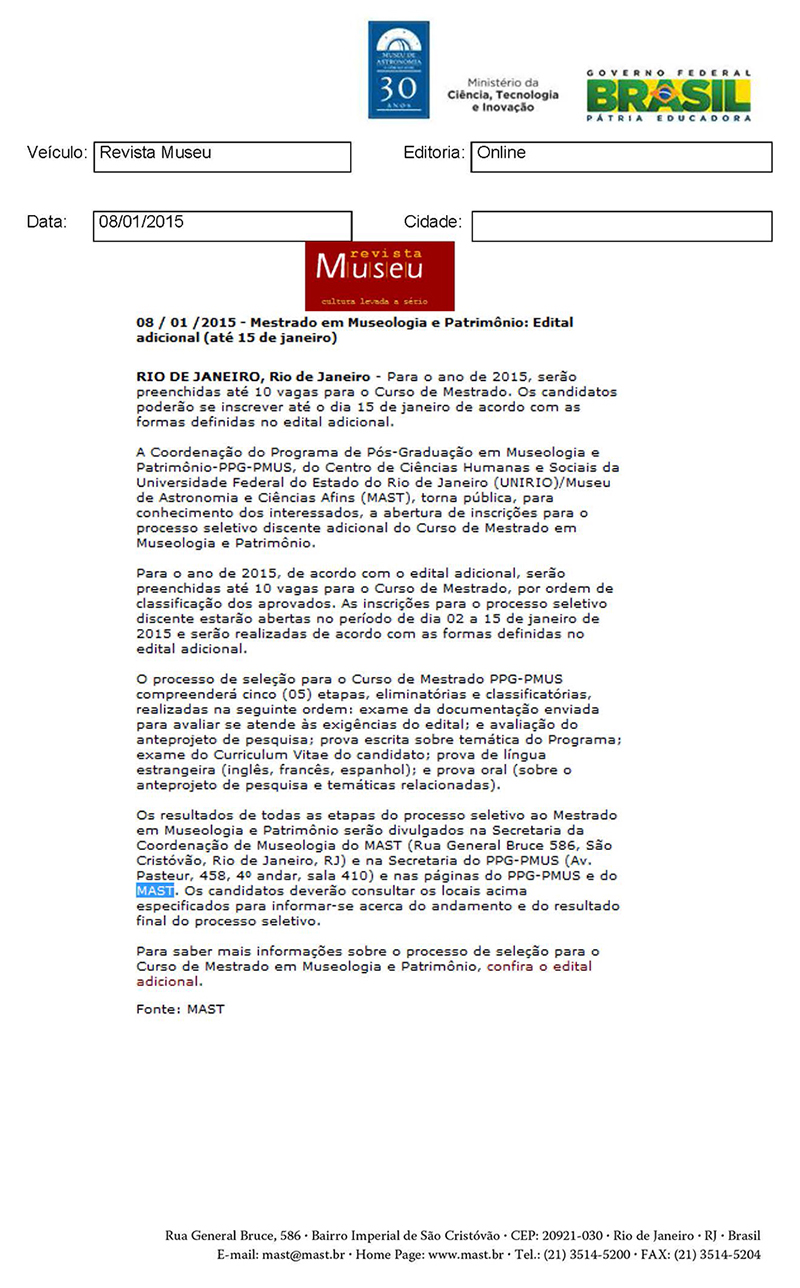 Revista Museu | Mestrado em Museologia e Patrimônio: Edital adicional (até 15 de janeiro)