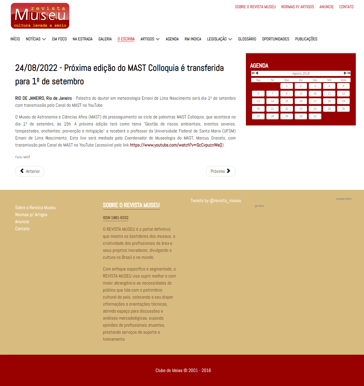 Revista Museu - Próxima edição do MAST Colloquia é transferida para 1º de setembro
