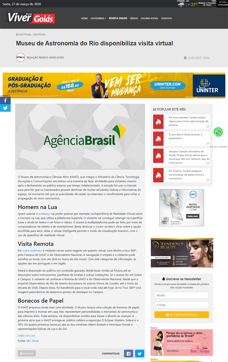 Revista Viver Goiás (Goiânia - GO) | MAST disponibiliza visita virtual