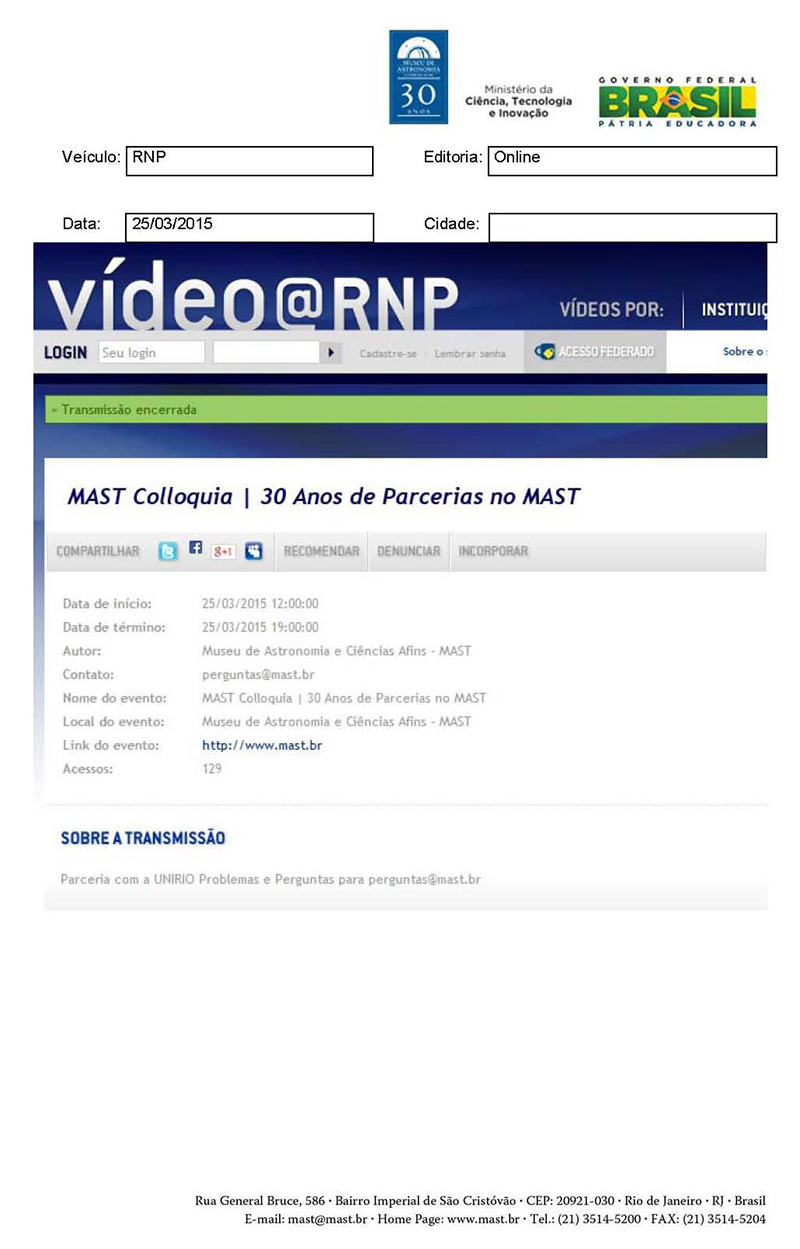 RNP | MAST Colloquia | 30 anos de Parceria no MAST