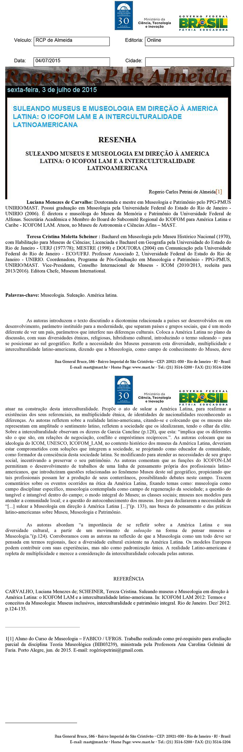 Rogério C P de Almeida | Suleando Museus e Museologia em direção à América Latina: O ICOFOM LAM e a Interculturalidade Latinoamericana