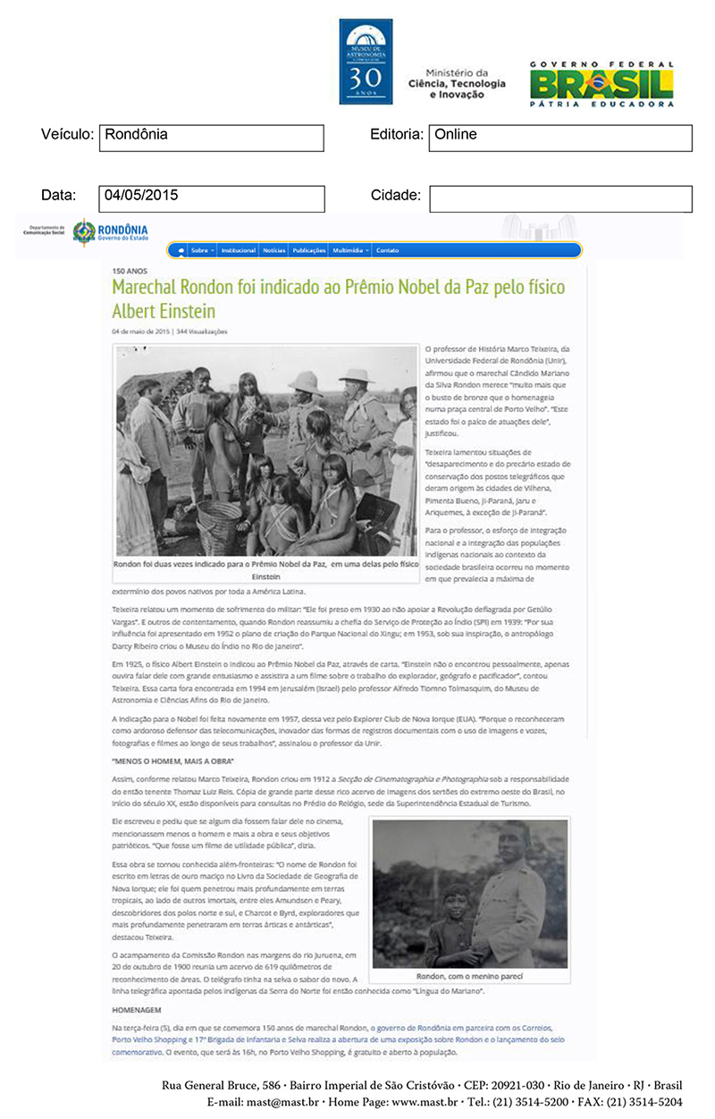 Rondônia | Marechal Rondon foi indicado ao Prêmio Nobel da Paz pelo físico Albert Einstein