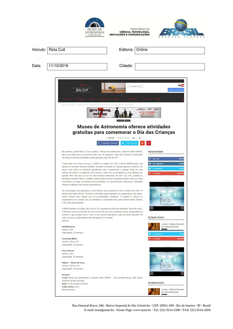 Rota Cult | Museu de Astronomia oferece atividades gratuitas para comemorar o Dia das Crianças