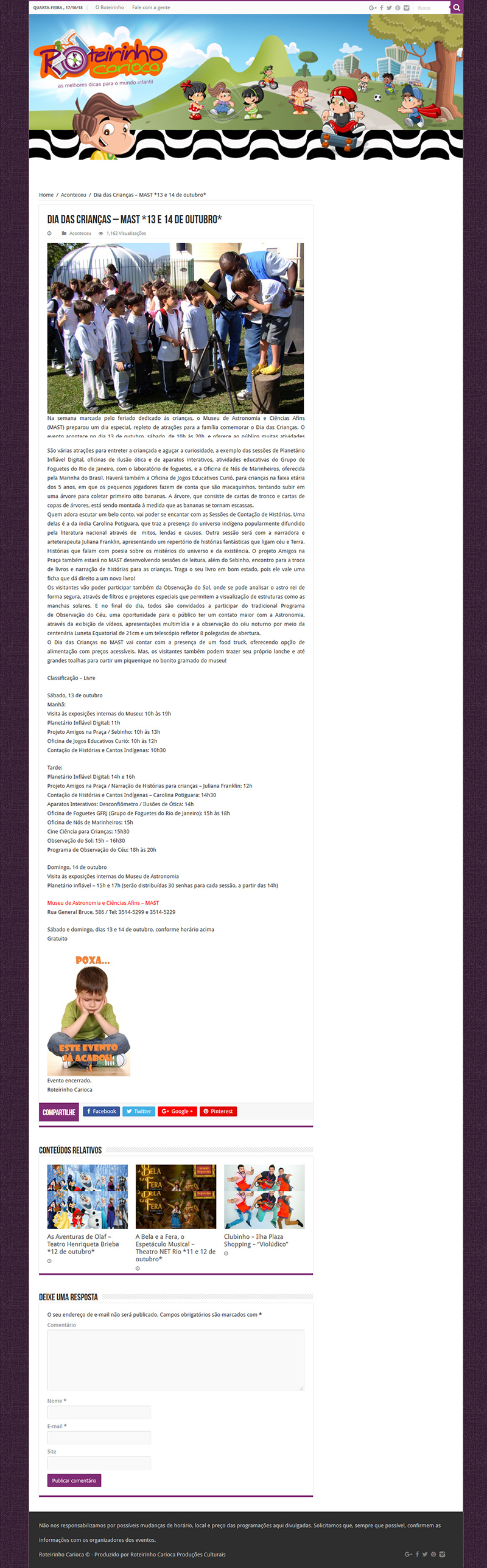 Roteirinho Carioca | Dia das Crianças - MAST 13 e 14 de outubro