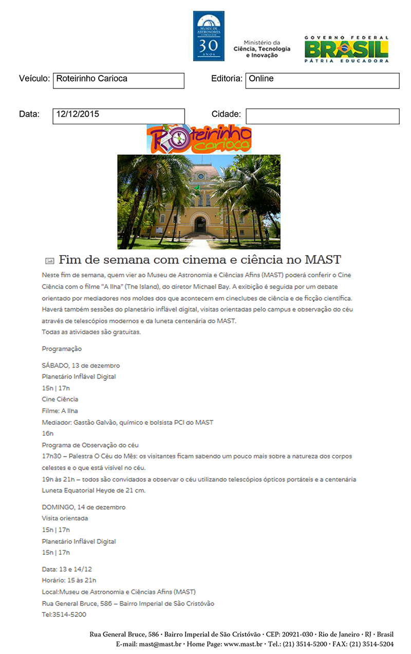 Roteirinho Carioca | Fim de semana com cinema e ciência no MAST