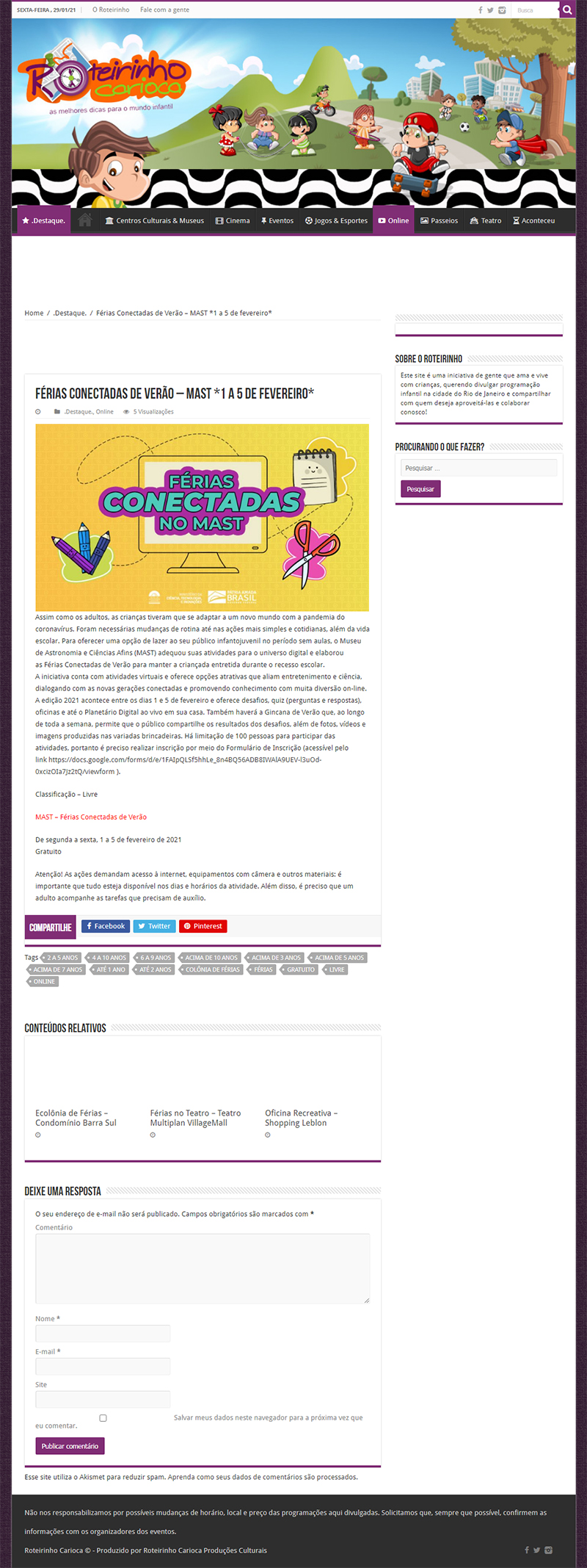 Roteirinho Carioca | MAST abre inscrições para a colônia virtual 'Férias Conectadas de Verão'