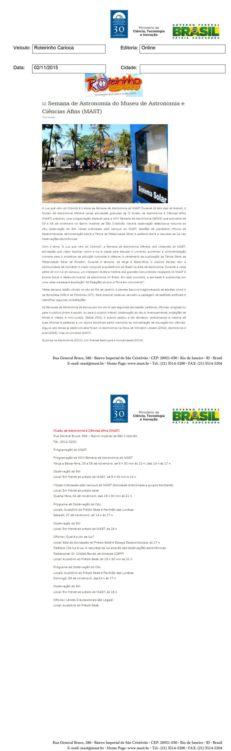 Roteirinho Carioca | Semana de Astronomia do Museu de Astronomia e Ciências Afins (MAST)