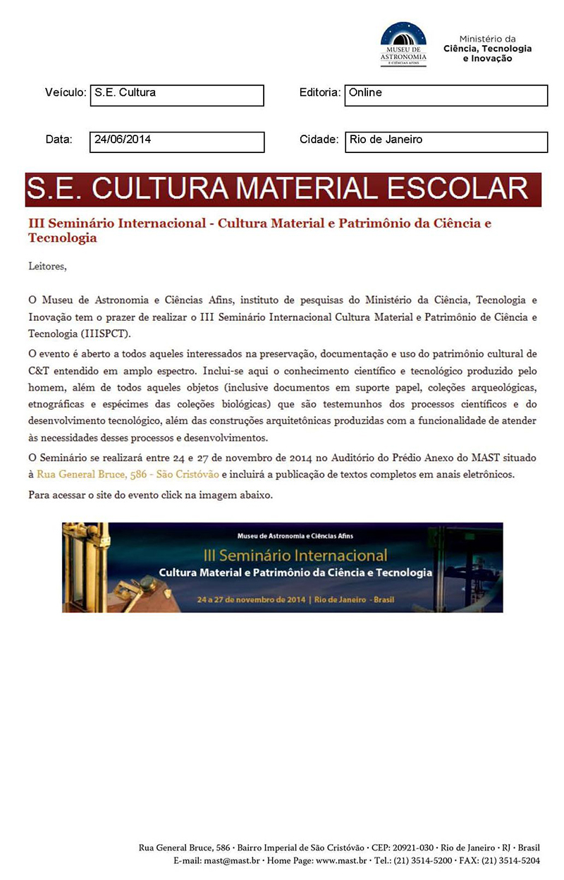 S. E. Cultura Material Escolar | III Seminário Internacional - Cultura Material e Patrimônio da Ciência e Tecnologia