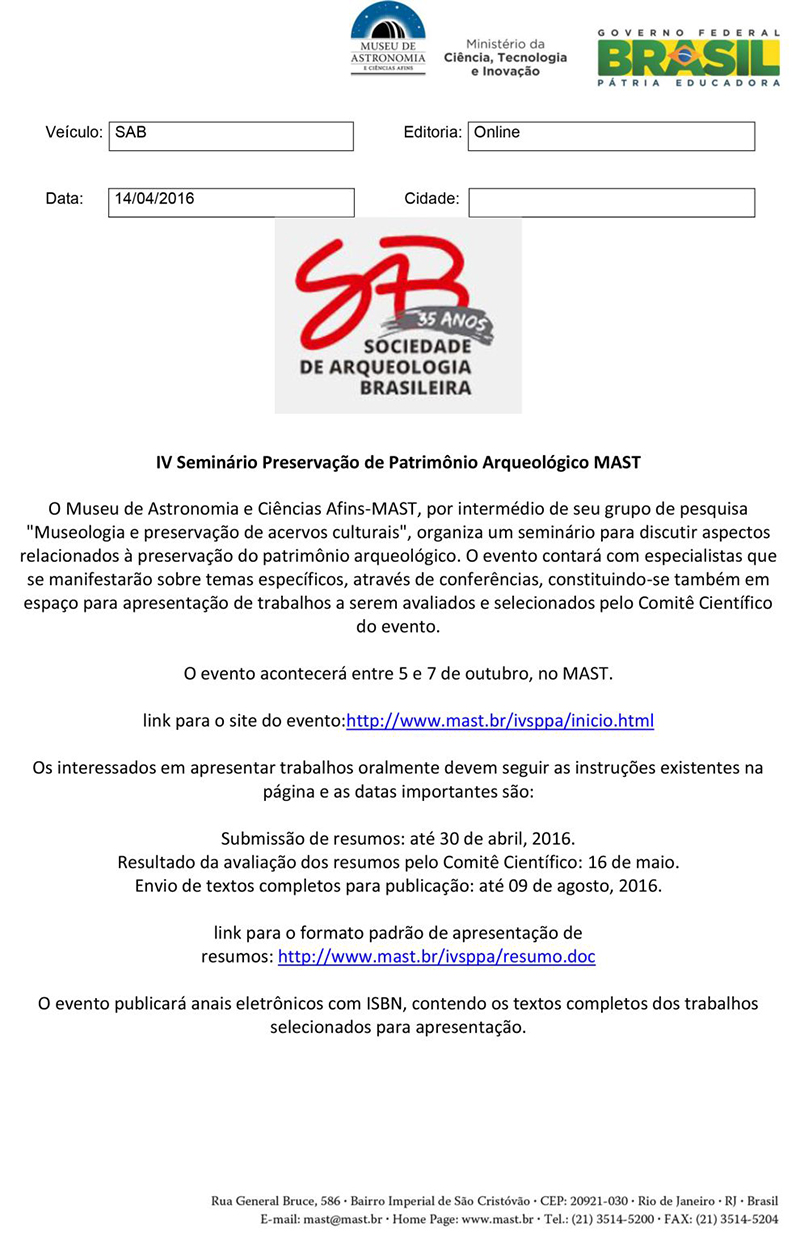SAB | IV Seminário Preservação de Patrimônio Arqueológico MAST