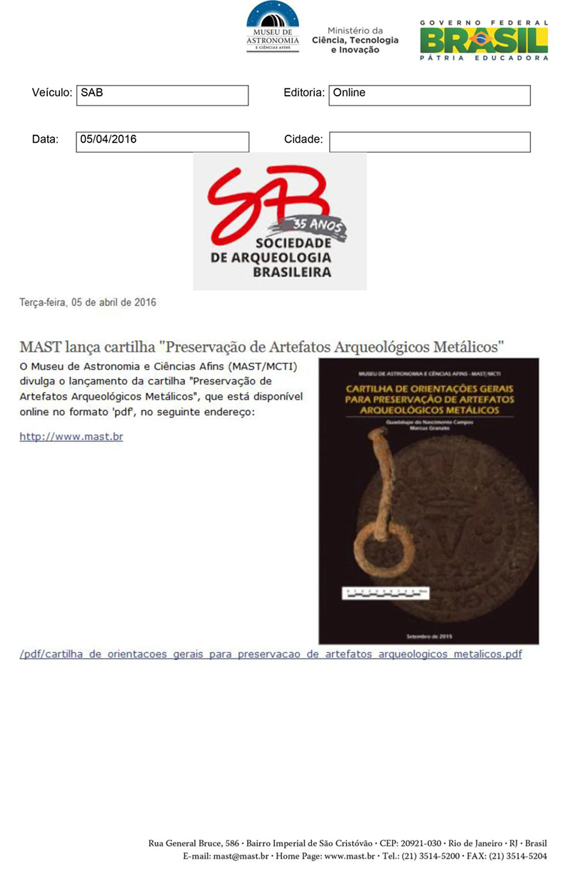 SAB | MAST lança cartilha "Preservação de Artefatos Arqueológicos Matálicos"