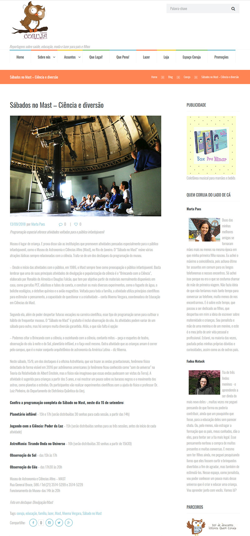 Site Quem Coruja | Sábado no MAST - Ciência e diversão
