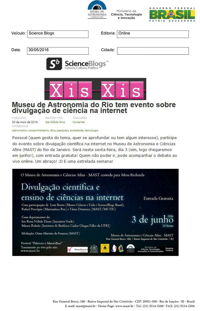 Science Blogs | Museu de Astronomia do Rio tem evento sobre divulgação de ciência na internet