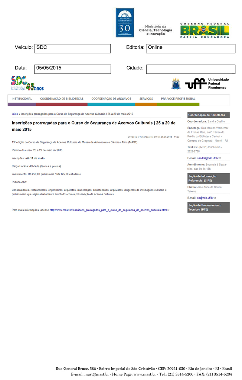 SDC | Inscrições prorrogadas para o Curso de Segurança de Acervos Culturais | 25 a 29 de maio 2015
