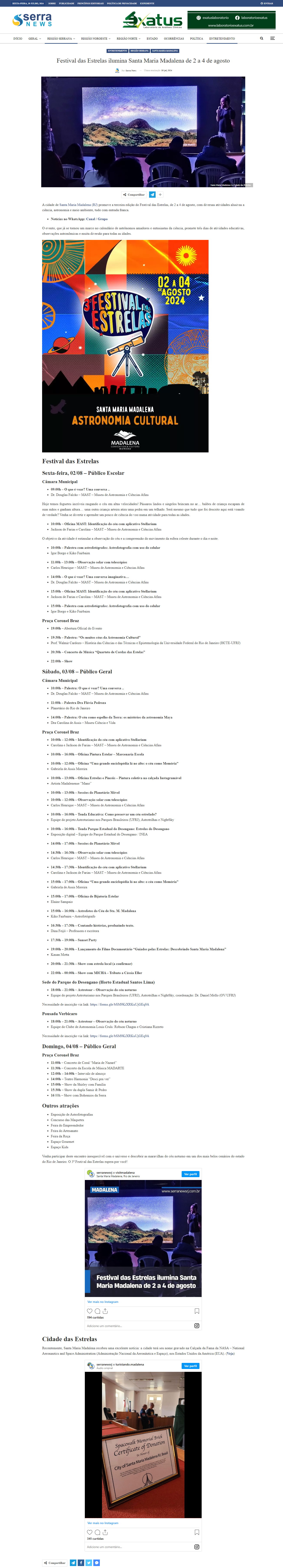 Serra News - Festival das Estrelas ilumina Santa Maria Madalena de 2 a 4 de agosto