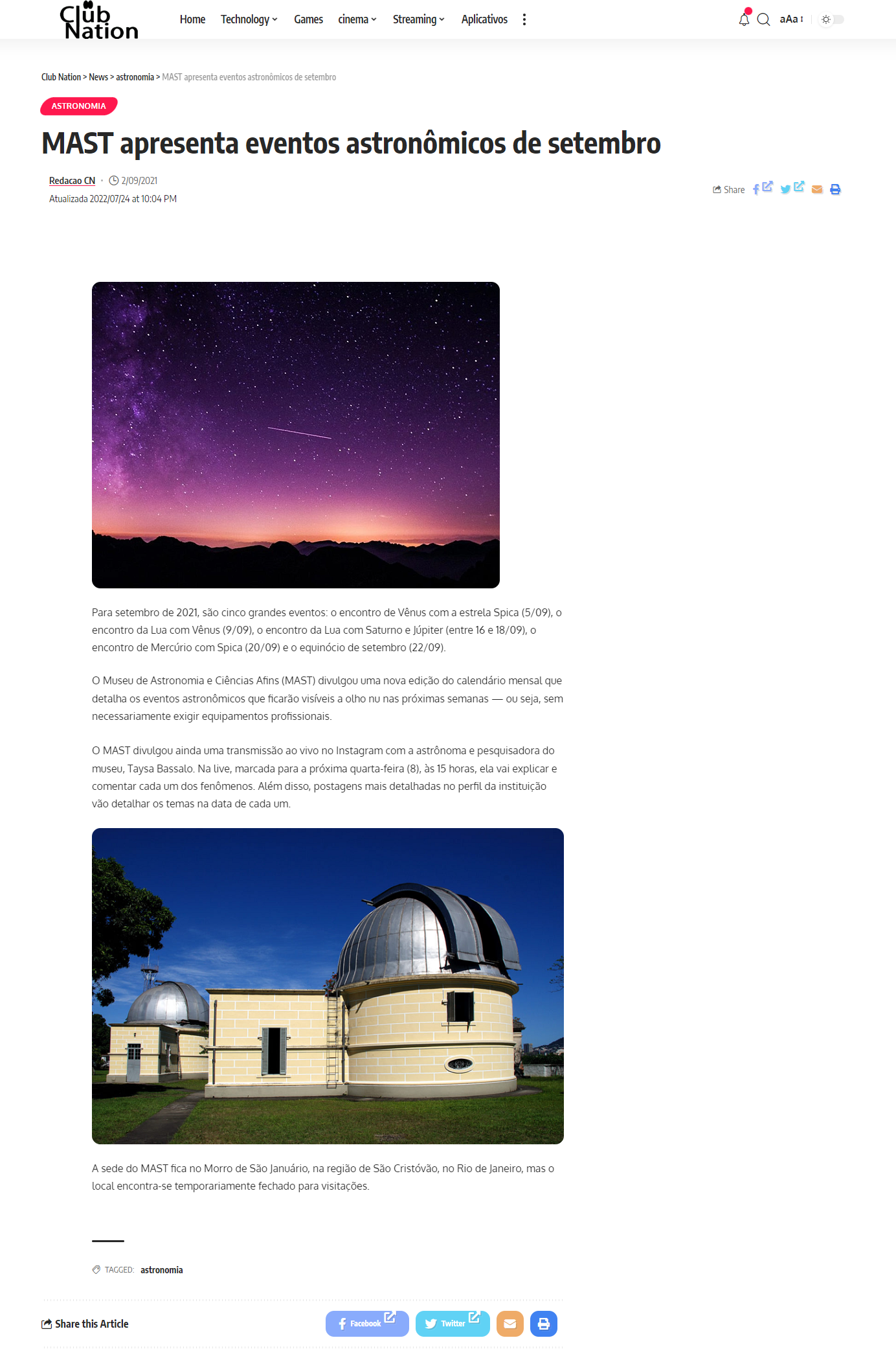 Site Club Nation - MAST apresenta eventos astronômicos de setembro