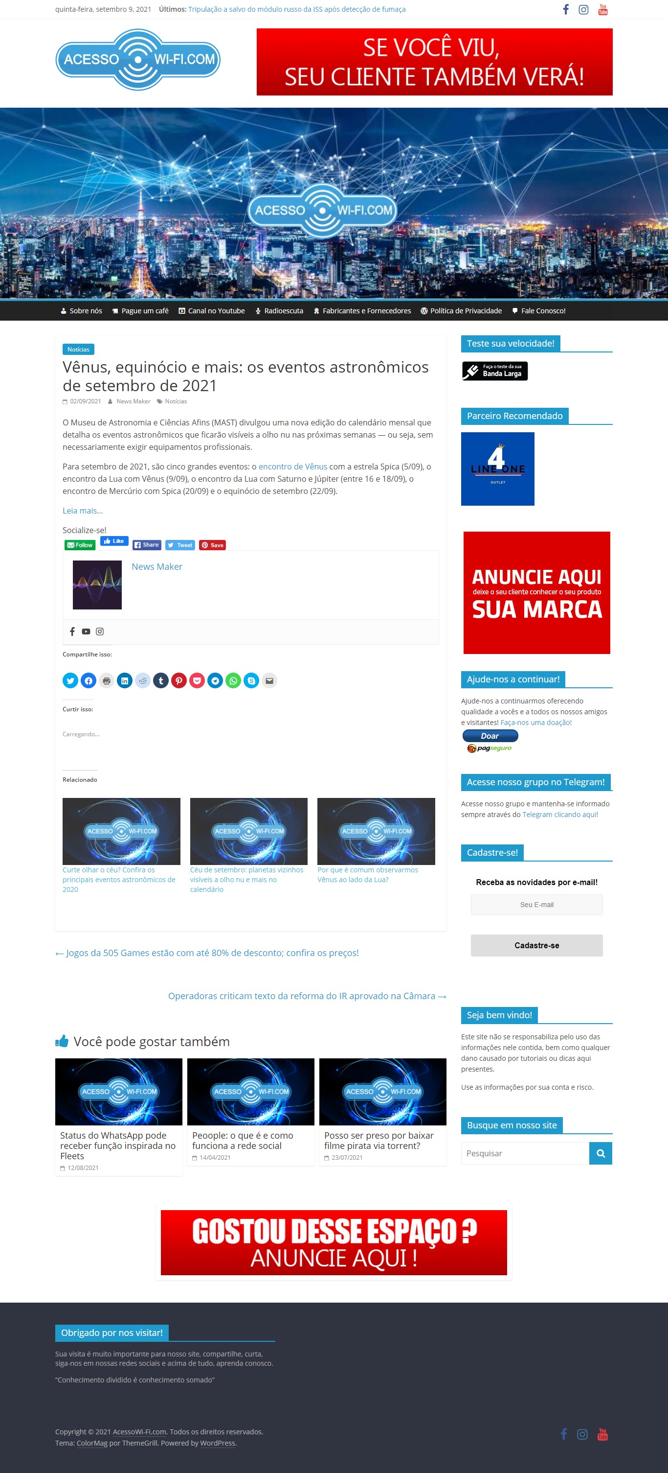Site de Notícias Acesso Wi-Fi.Com - MAST na reportagem 'Vênus, equinócio e mais: os eventos astronômicos de setembro de 2021'