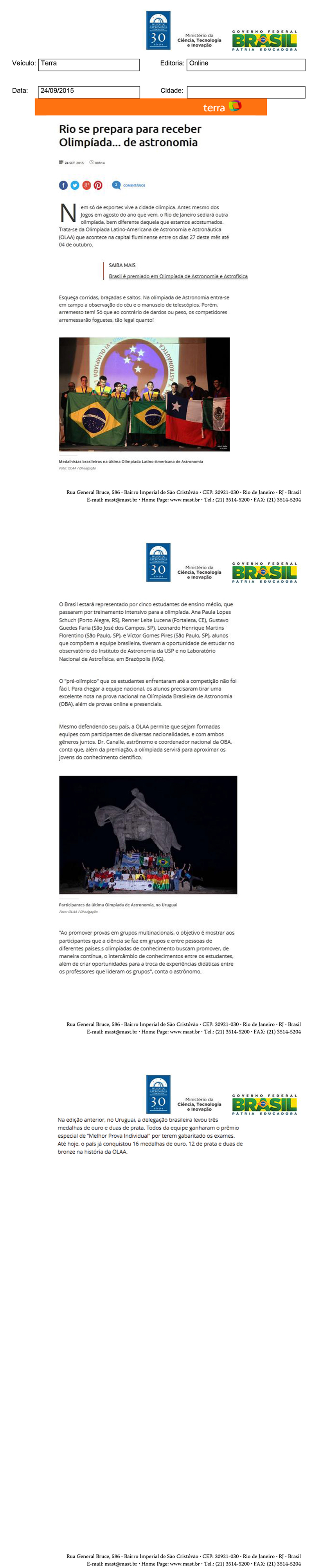 Site Terra | Rio se prepara para receber Olimpíada...de Astronomia