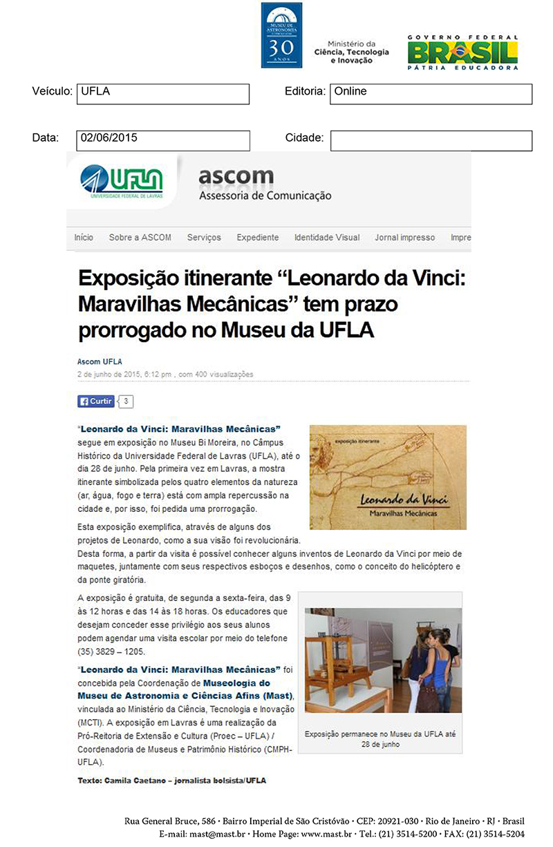 Site UFLA | Exposição itinerante "Leonardo da Vinci: Maravilhas Mecânicas" tem prazo prorrogado no Museu UFLA