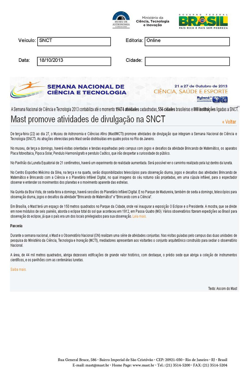 SNCT | MAST promove atividades de divulgação na SNCT
