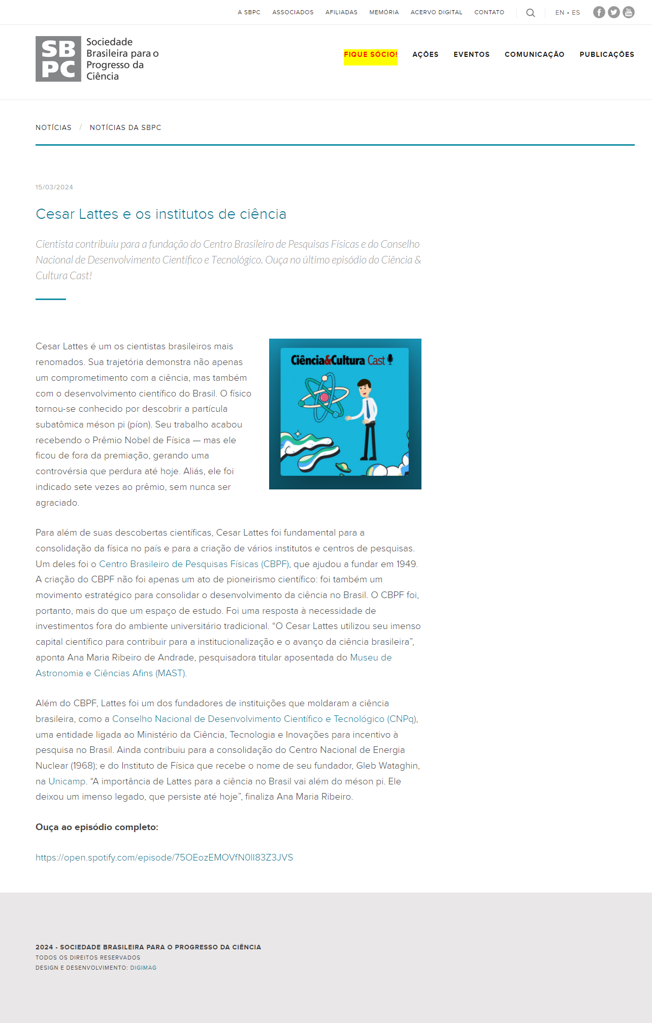 Sociedade Brasileira para o Progresso da Ciência (SBPC) - Cesar Lattes e os institutos de ciência