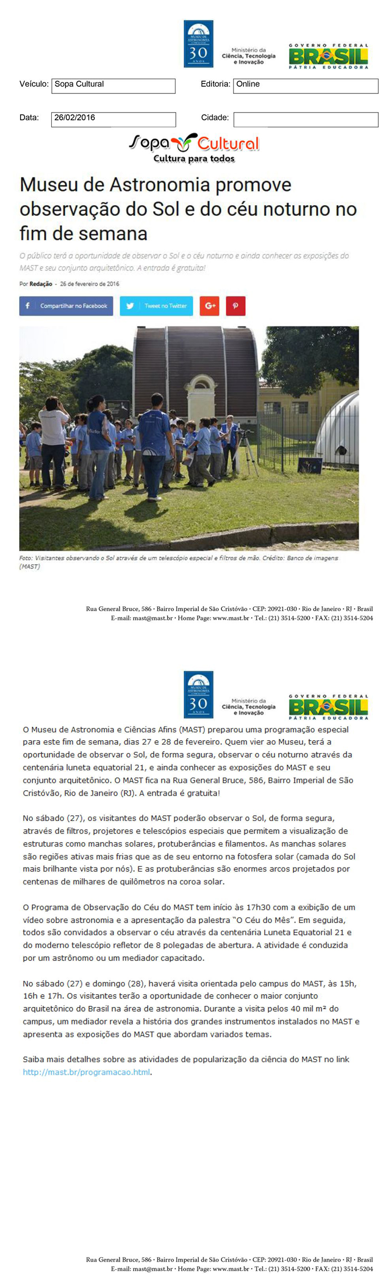 Sopa Cultural | Museu de Astronomia promove observação do Sol e do céu noturno no fim de semana