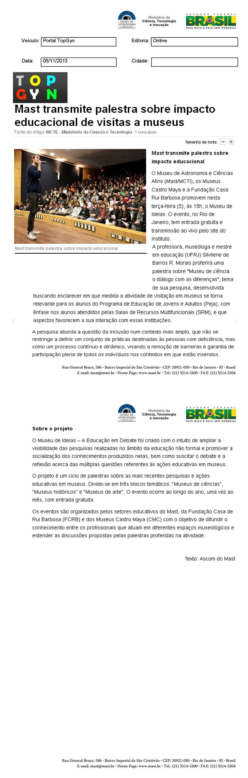 Top Gyn | MAST transmite palestra sobre impacto educacional de visitas a museus