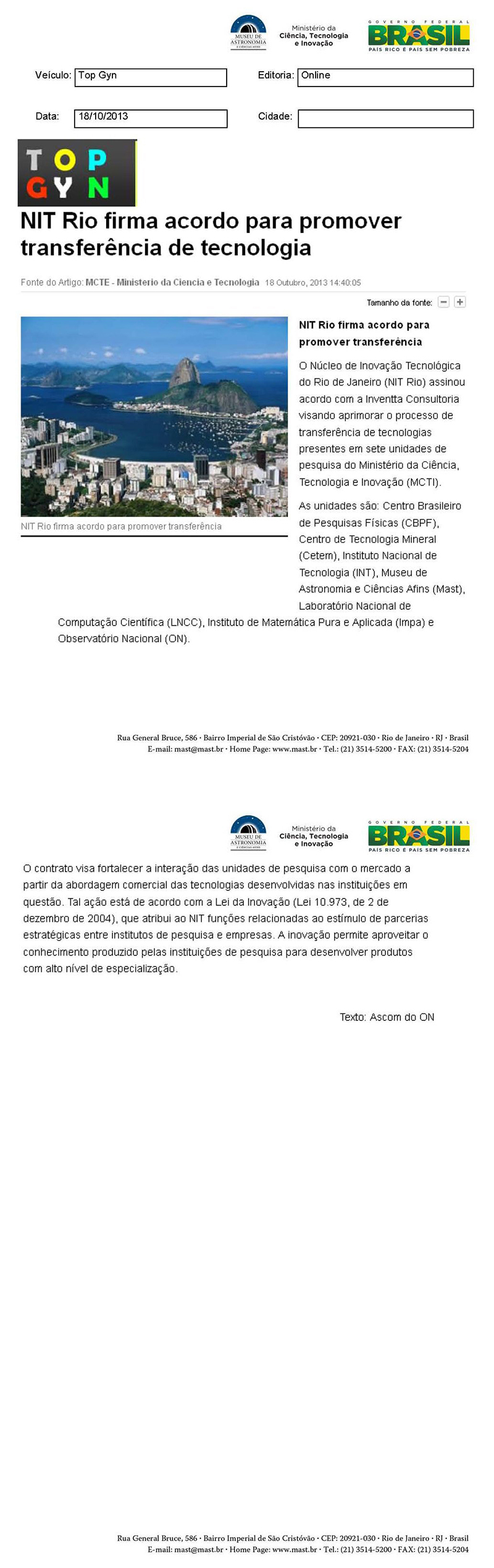 Top Gyn | NIT Rio firma acordo para promover transferência de tecnologia