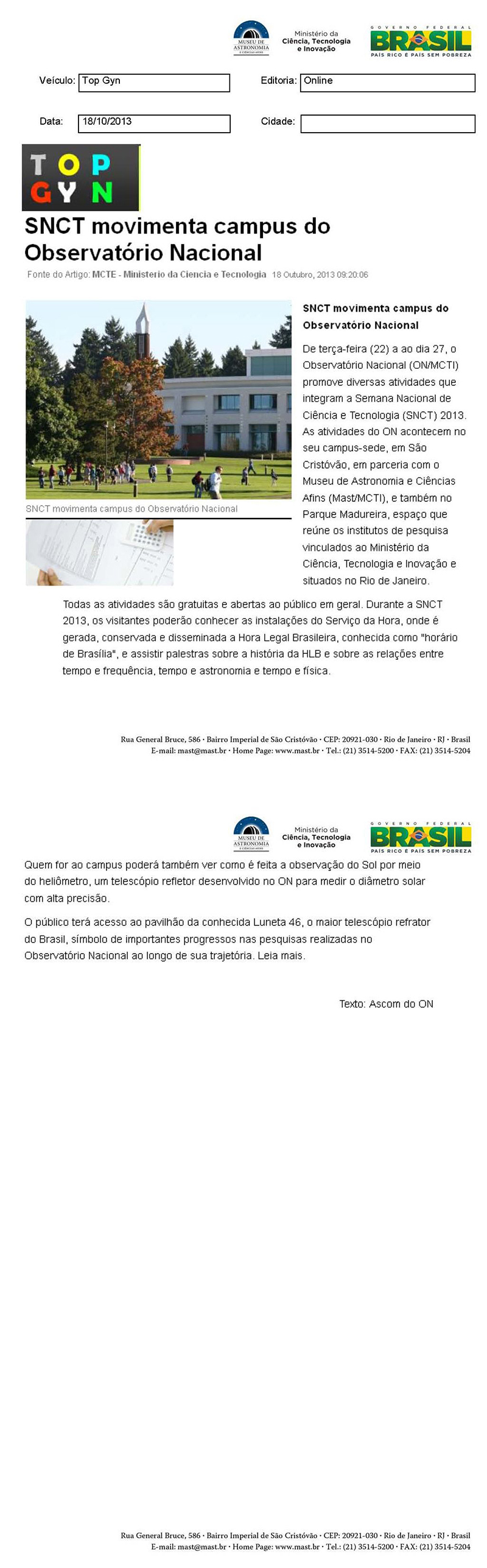 Top Gyn | SNCT movimenta campus do Observatório Nacional