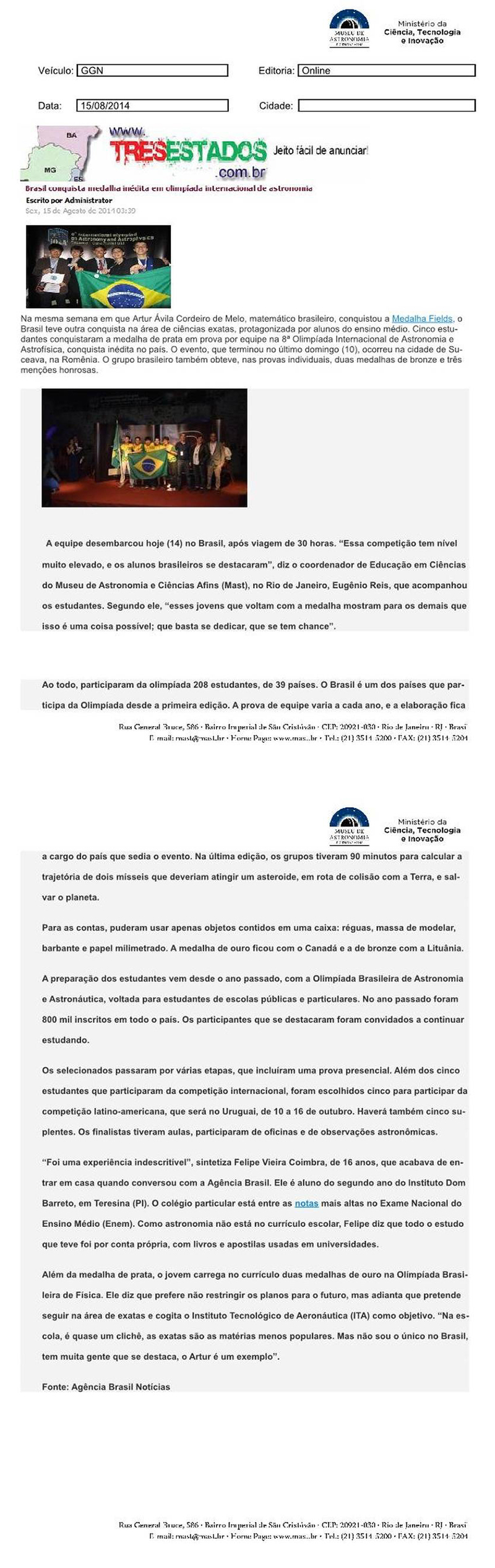Três estados | Brasil conquista medalha inédita em olimpíada internacional de astronomia