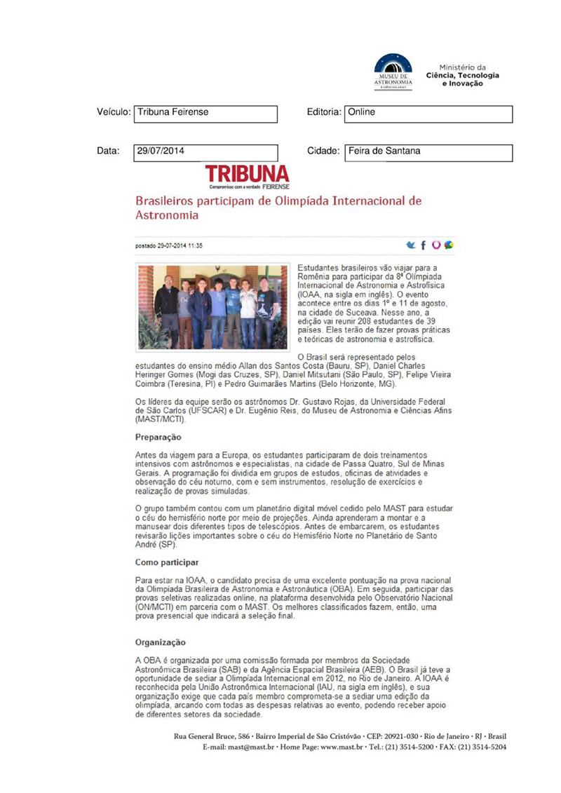 Tribuna Feirense | Brasileiros participam de Olimpíada Internacional de Astronomia