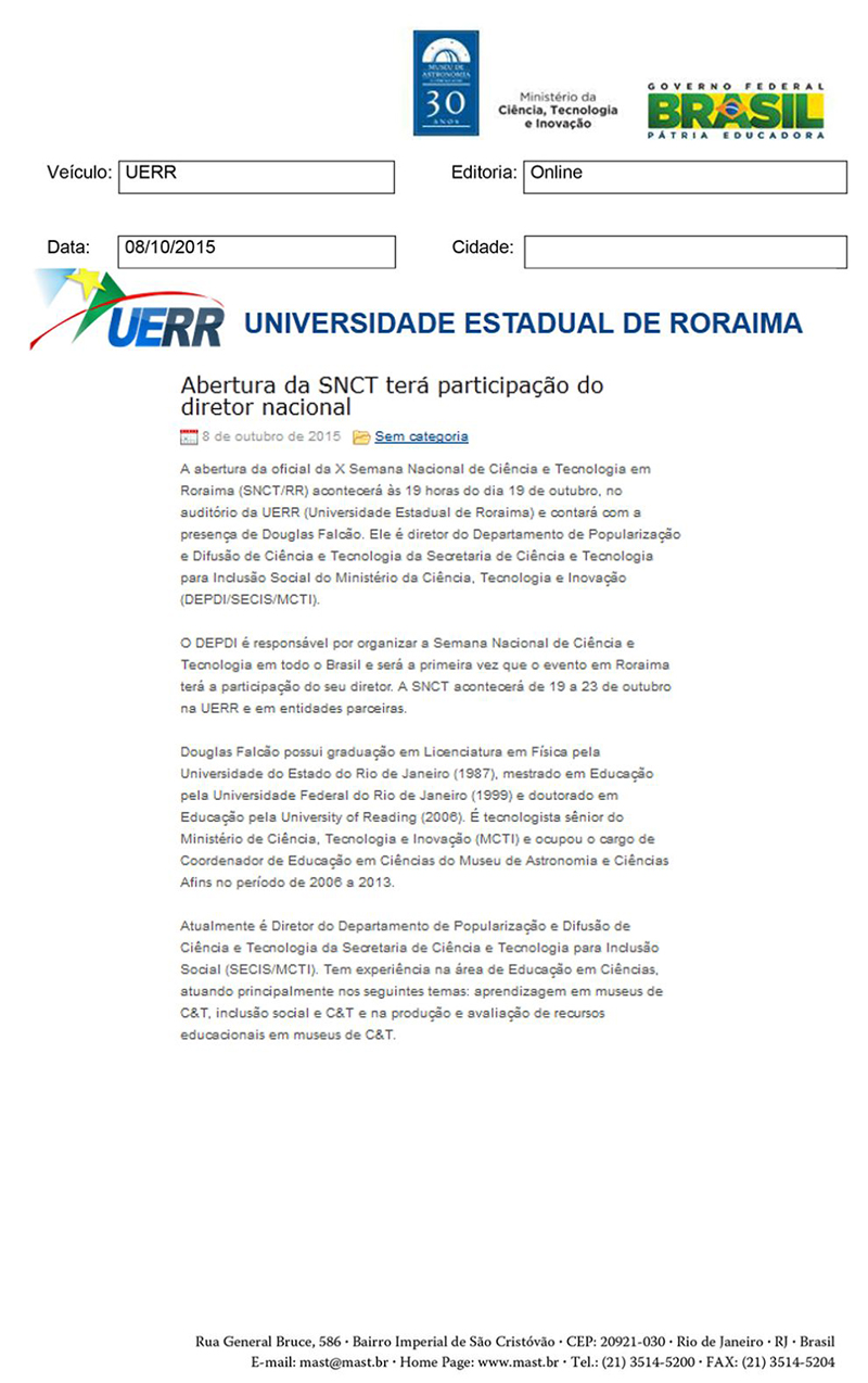 UERR | Abertura da SNCT terá participação do diretor nacional