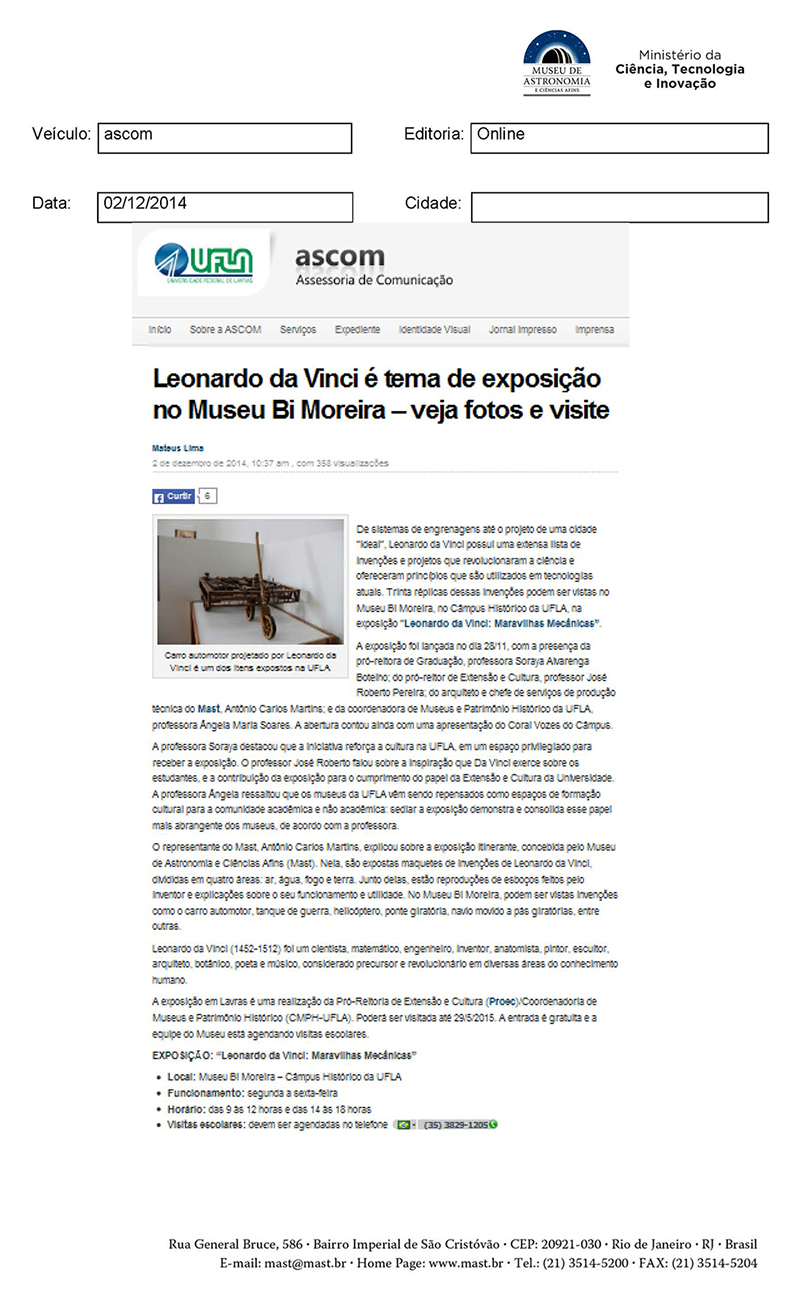 UFLA | Leonardo da Vinci é tema de exposição no Museu Bi Moreira