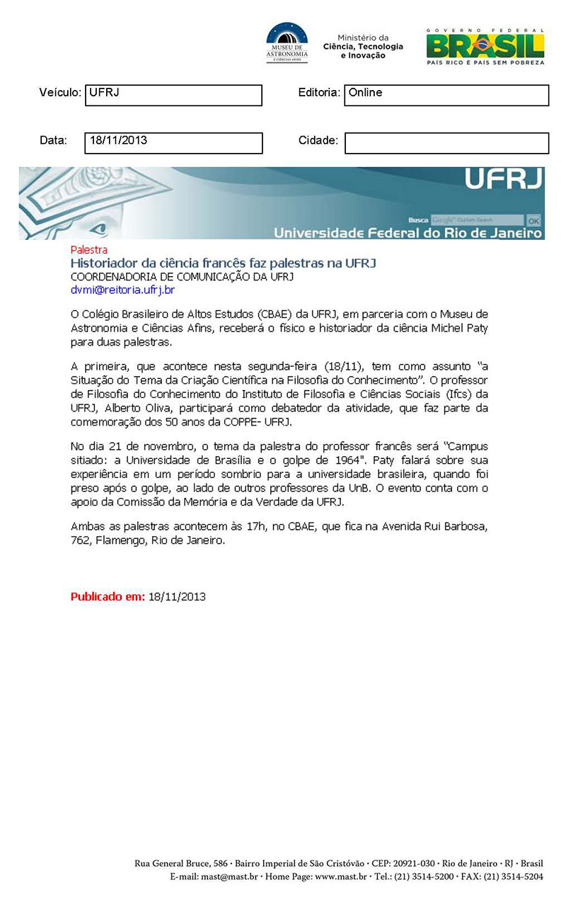 UFRJ | Historiador da Ciência francês faz palestra na UFRJ