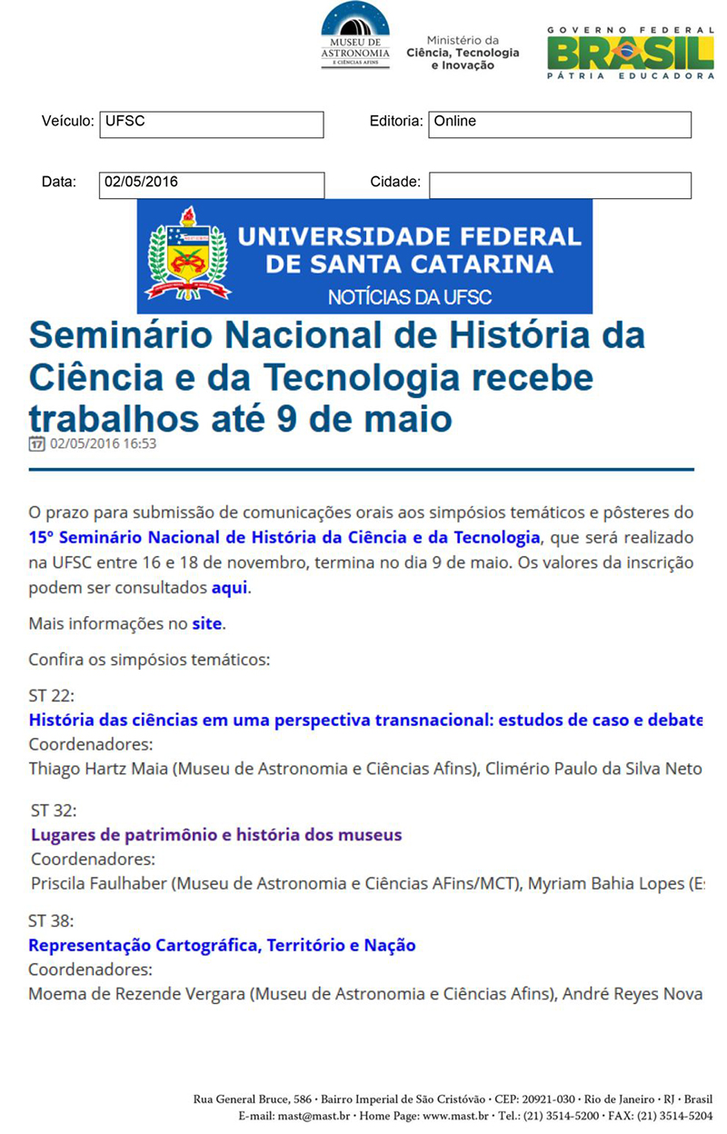 UFSC | Seminário Nacional de História da Ciência e da Tecnologia recebe trabalhos até 9 de maio