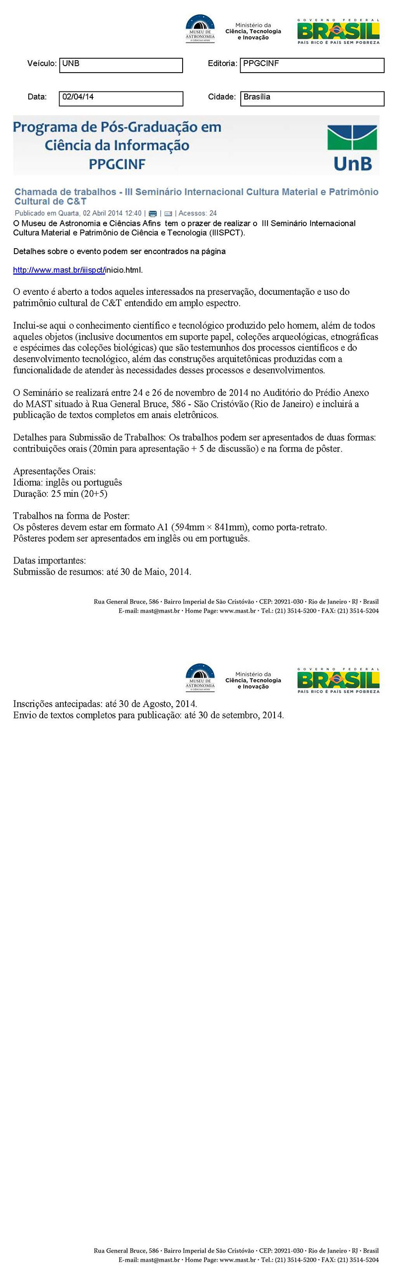 UNB | Chamada para trabalhos - III Seminário Internacional Cultura Material e Patrimônio Cultural de C&T