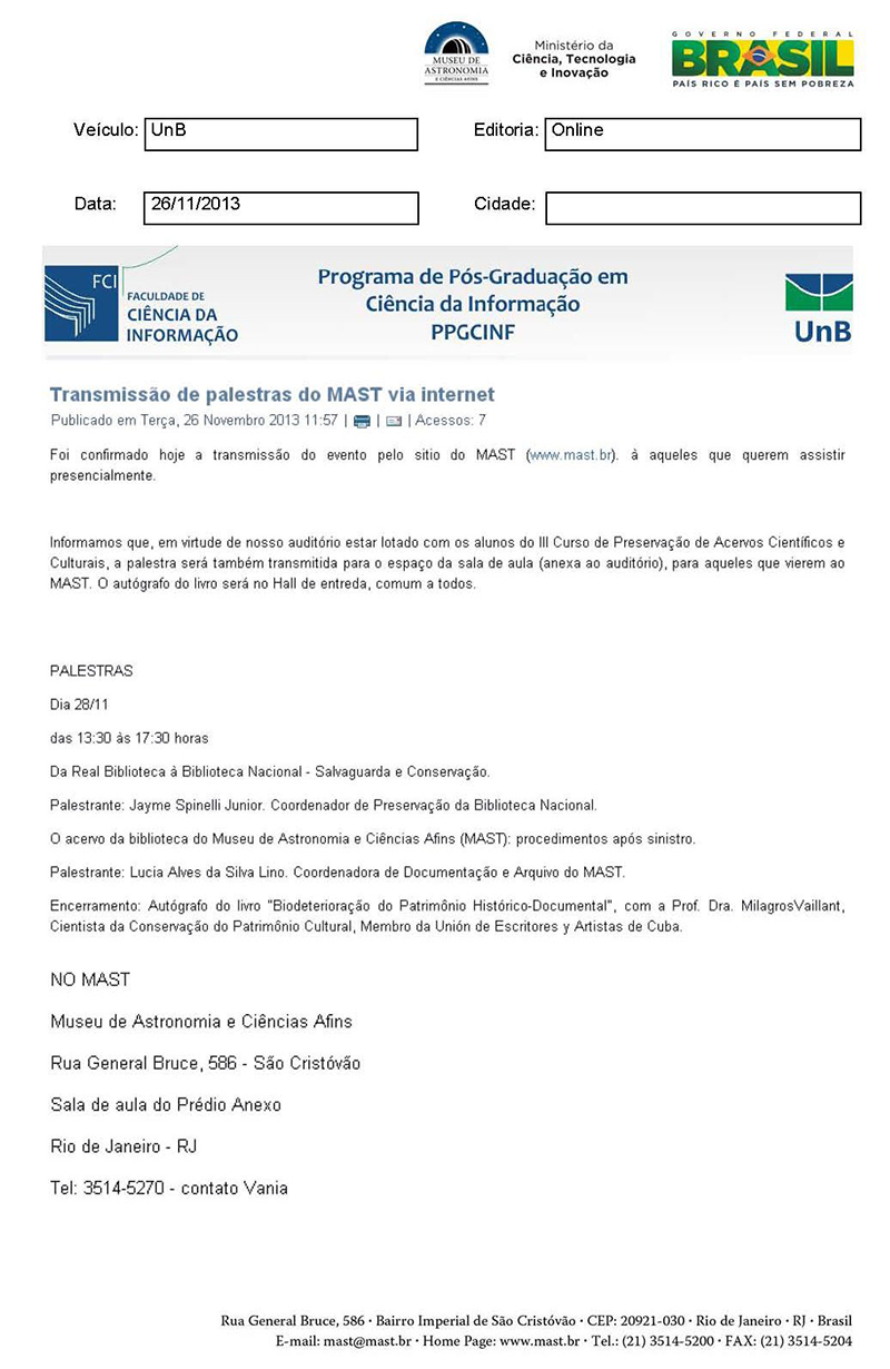 UnB | Transmissão de palestra do MAST via internet