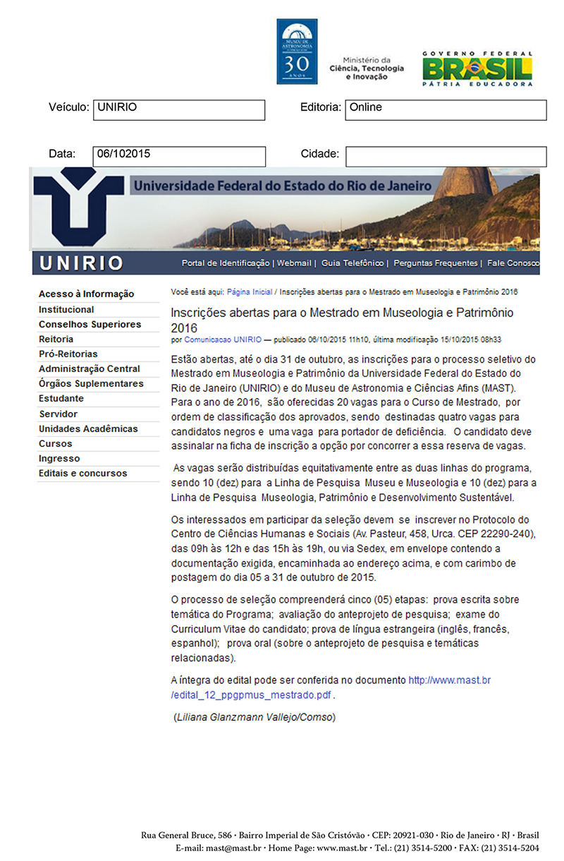 UNIRIO | Inscrições abertas para o Mestrado em Museologia e Patrimônio 2016
