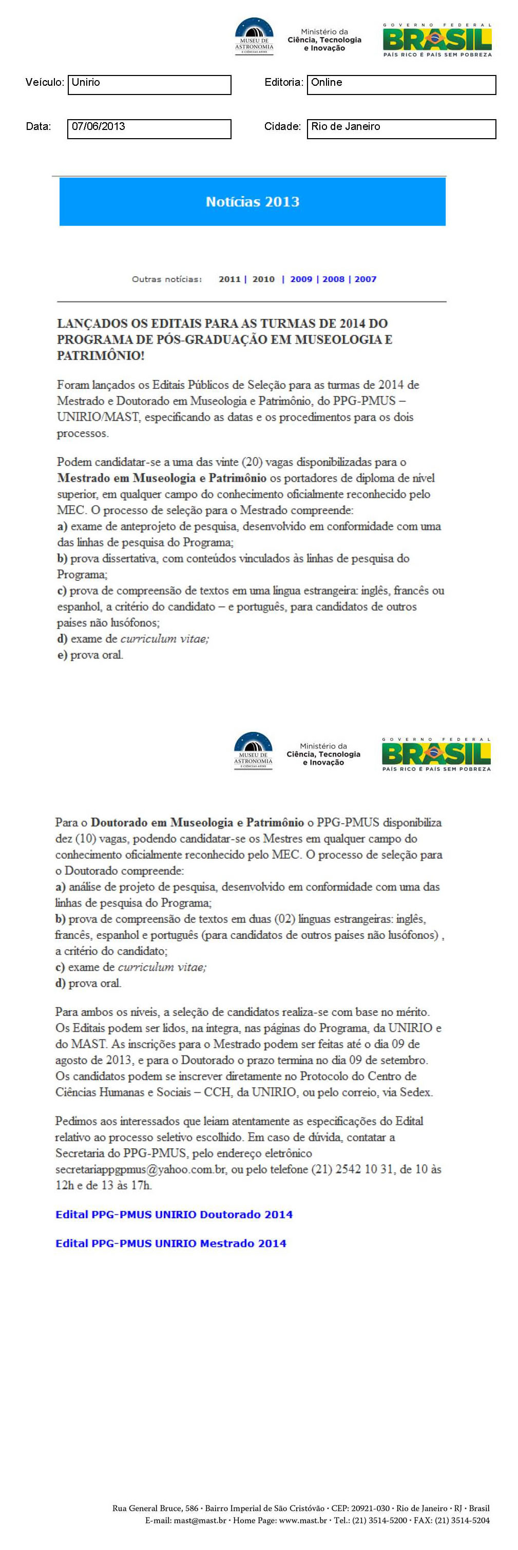 UNIRIO | Lançados os editais para as turmas de 2014 do Programa de Pós-Graduação em Museologia e Patrimônio