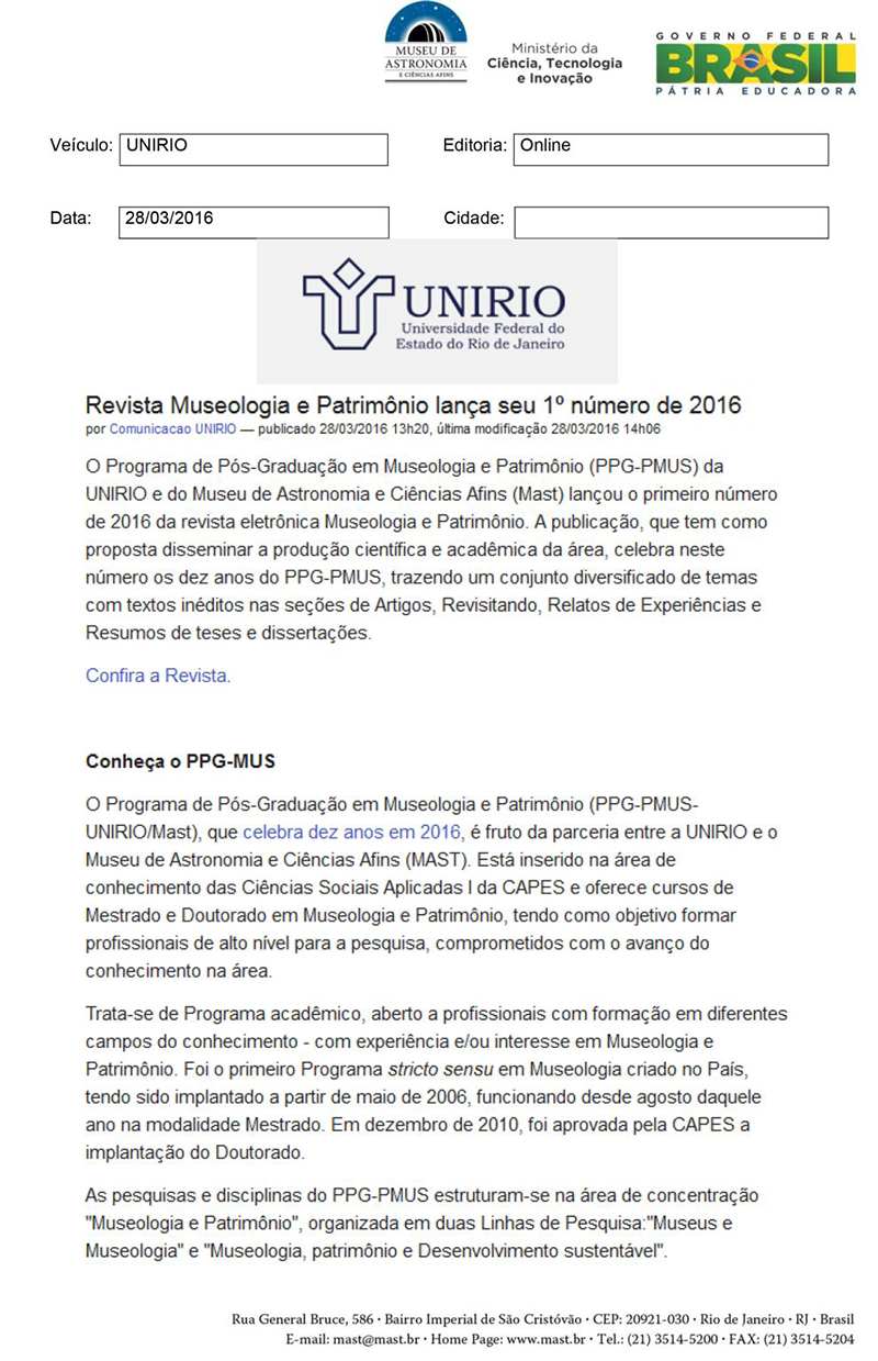UNIRIO | Revista Museologia e Patrimônio lança seu 1º número de 2016