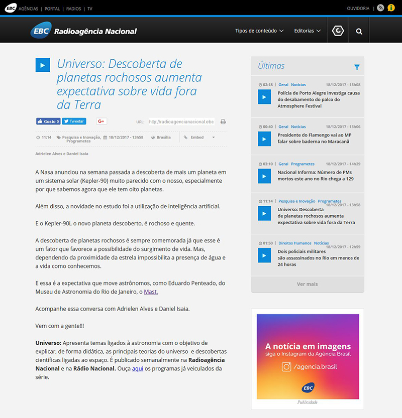 Agência Brasil - EBC | Universo: Descoberta de planetas rochosos aumenta expectativa sobre vida fora da Terra